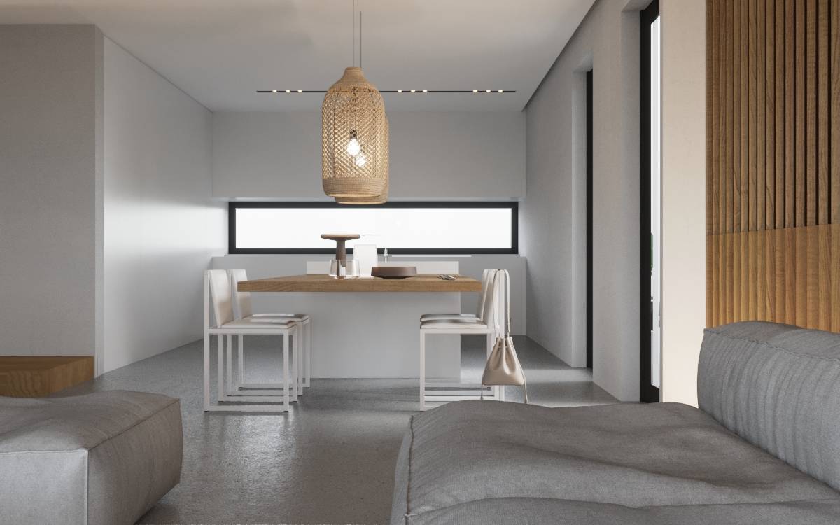 Projekt wystroju wnętrza domu jednorodzinnego dla indywidualnego inwestora z Częstochowy. Jasne kolory ścian powiększają pomieszczenia przeznaczone do użytku dziennego i czynią je przyjaznymi w codziennym użytkowaniu. Przełamywane są frontami, blatami oraz lamelami wykonanymi z naturalnego drewna oraz czarnymi i szarymi dodatkami. W części rekreacyjnej stylowa kanapa w kolorach szarości. Wnętrze łazienki utrzymane w ciemnej kolorystyce, uzupełnianą dodatkami w bieli i kolorze drewna.